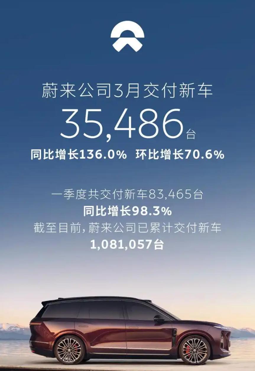 2蔚来公司以35486辆位列第三,同比暴增136%,环比增长70.6%,一季度交付83465辆,超出此前交付指引上限,同比增长98.3%。