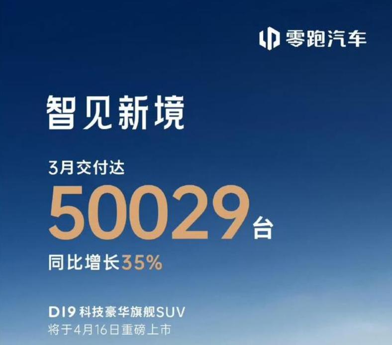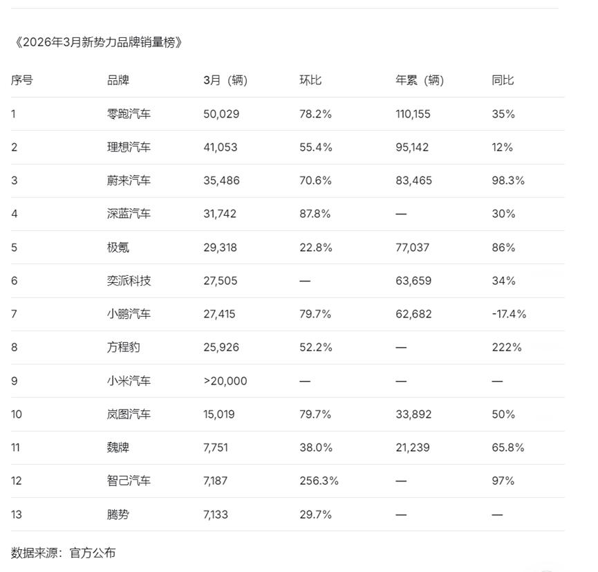 1零跑以50029辆登顶,同比增长35%,环比暴增78.25%,再次成为2026年度首个月销突破5万辆的造车新势力。