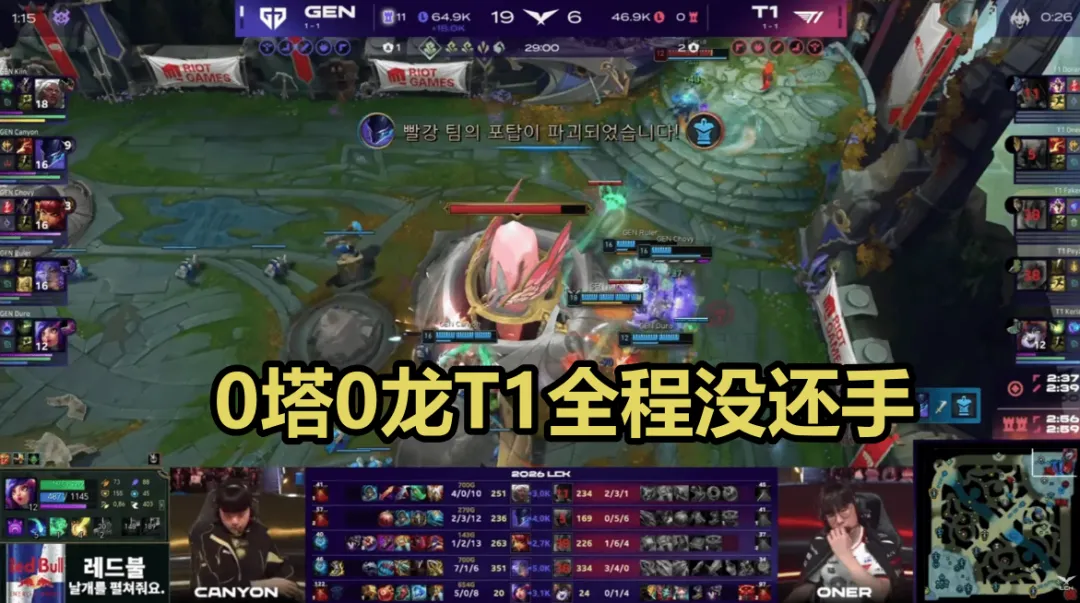 先说说第一局。T1蓝色方,GEN红色方。对线阶段T1就全线哑火,Faker的瑞兹被Chovy的冰鸟死死限制在中路,根本无法游走支援。上路更离谱,Doran的杰斯竟然被Kiin的塞恩完成了单杀!塞恩单杀杰斯,这画面你敢信?比赛中期,龙坑团战成了T1的噩梦,GEN连续两波打出1换4,Chovy的冰鸟凭借完美技能释放和地形把控,把T1阵型分割得七零八落。T1全程被折磨,毫无翻盘机会,GEN稳扎稳打拿下首局。