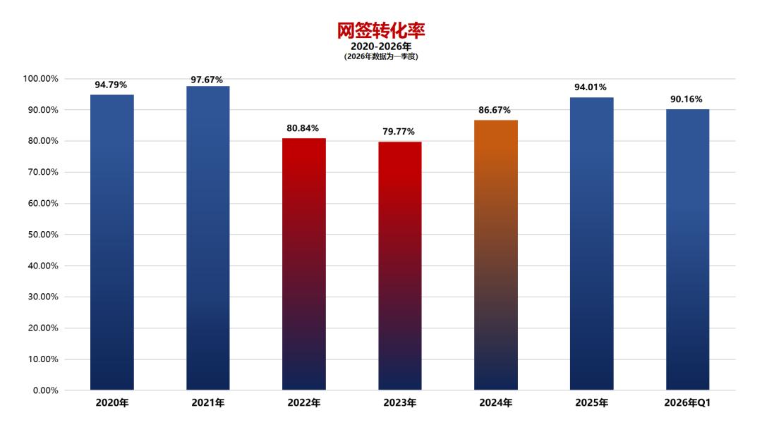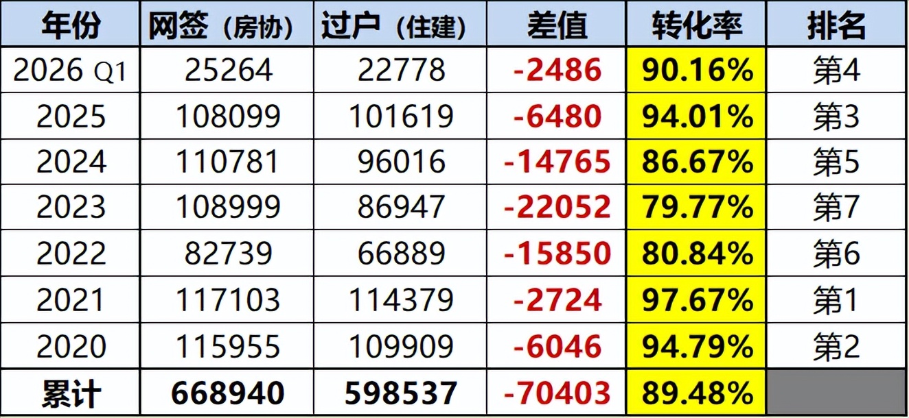 8、2026年(Q1):网签25264套,过户22778套,转化率90.16%