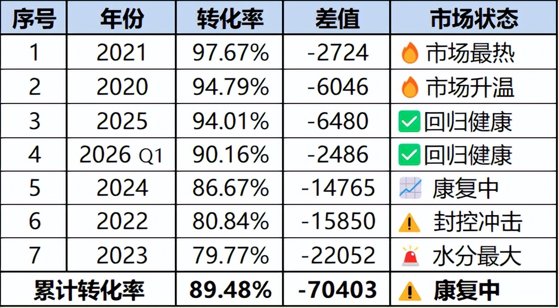 回顾近六年数据,2023年是市场水分最大的一年——网签108999套,过户仅86947套,转化率低至79.77%,相当于每5个网签就有1个未能走到过户。到2025年,过户量连续四年上升,转化率连续三年上升。这说明业主反悔在减少,贷款失败在下降,非真实交易在压缩,市场“水分”正被逐步挤掉,交易确定性在提高。