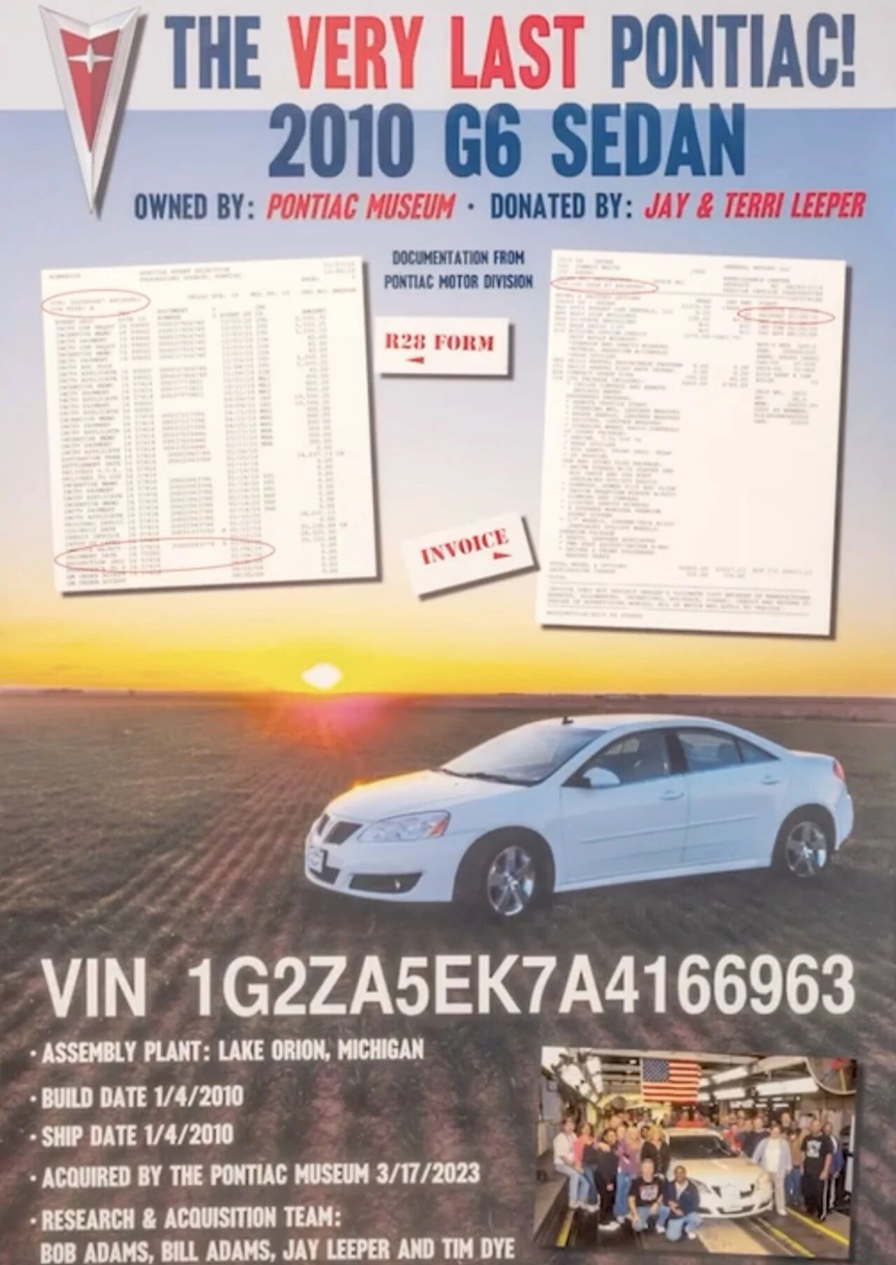 外界一直认为,最后一台庞蒂亚克是一台2010款G6 Summit白色外观配黑色内饰,搭载2.4升四缸VVT发动机,出厂即作为租赁车辆送往夏威夷,最终在加州事故报废,庞蒂亚克交通博物馆也长期以VIN尾号166962为目标寻找,2012年更有消息称该车已报废、里程约6万英里,仅以450美元拍卖流出,疑似运往墨西哥,2015年甚至重新获得了新的产权文件,所有人都以为这就是末代庞蒂亚克的悲剧结局。