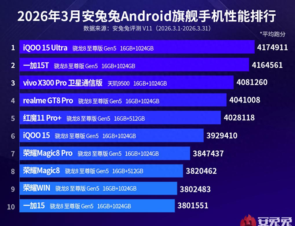 现在的手机性能越来越强了,强到已经有笔记本也开始搭载手机芯片了,比如苹果全新发布的MacBookNeo搭载的就是A18Pro芯片。这种跨界融合标志着移动端算力已然过剩,足以重塑生产力工具。而对于安卓阵营,性能每年的提升速度甚至要比苹果大不少,,根据安兔兔公布的手机性能榜单,目前手机性能梯队的“三剑客”当属iQOO15Ultra、一加15T以及vivoX300Pro。这三款机器不仅是单纯的堆料,更是针对电竞、小屏和影像三个细分赛道的极致探索,代表了目前安卓工业设计的最高水准。