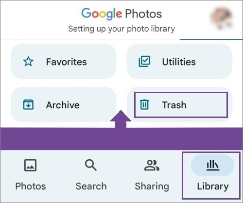 第 2 步。点击 Google 相册应用中的“垃圾箱”按钮。