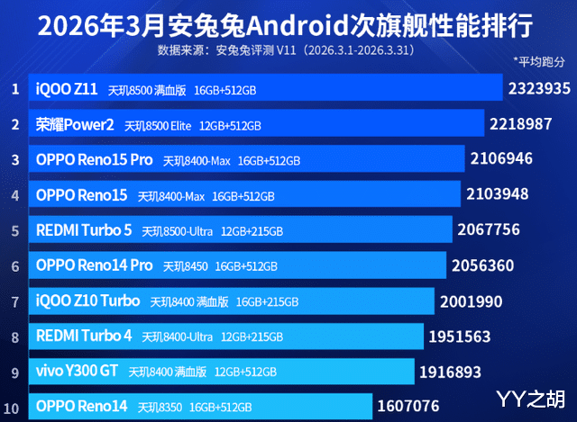 最后,在2026年3月份安兔兔安卓次旗舰手机性能排行榜中,iQOO Z10 Turbo和REDMI Turbo4分列第七名和第八名。在安兔兔平台上,这两款智能手机的平均跑分分别为2001990分和1951563分。在此之后,vivo Y300 GT和OPPO Reno14分列第九名和第十名。在安兔兔平台上,这两款智能手机的平均跑分分别为1916893分和1607076分。其中,vivo Y300 GT是vivo于2025年5月9日发布的智能手机,提供沙漠金与黑色两种配色,包含8GB+256GB、12GB+256GB、12GB+512GB三种存储规格。