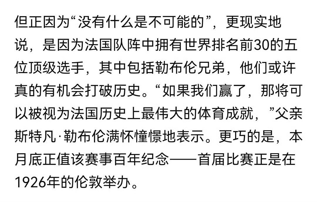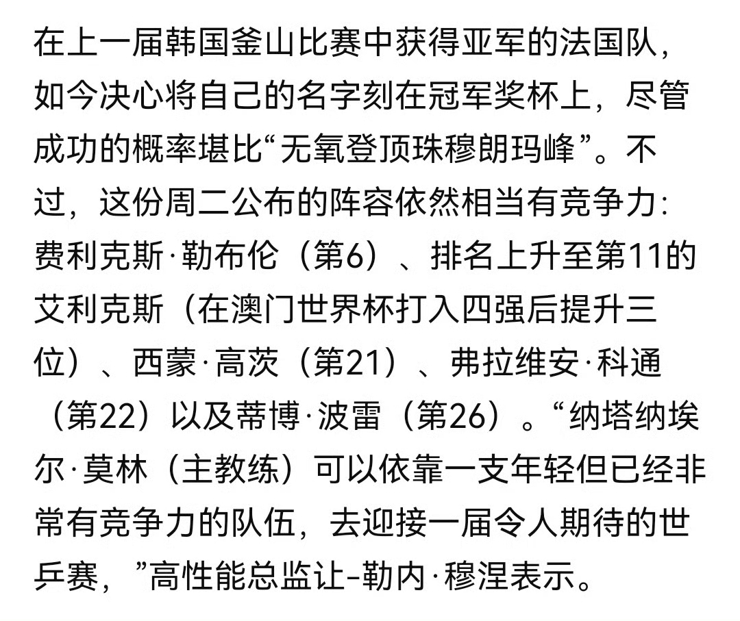 无独有偶,在巴黎奥运会上获得男团季军的法国男队也在媒体中表述将本次伦敦团体世乒赛目标定为夺金。法国男队目前拥有菲利克斯勒布伦和艾力克斯勒布伦以及西蒙高茨三位高水平选手。确实有足够实力冲击冠军奖杯。
