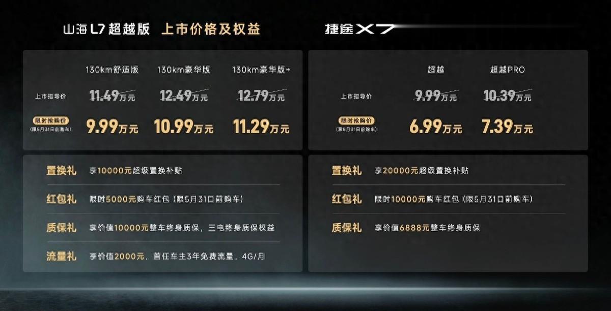 先从大家关心的价格来看,“宽体舒适大七座SUV”2026款捷途X70超越版,推出了2款车型,售价区间9.99-10.39万,限时权益价格6.99-7.39万;“5+2座精品电混SUV”2026款捷途山海L7超越版,推出了3款车型,售价区间11.49-12.79万,限时权益价格9.99-11.29万。
