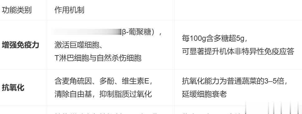 | 抗氧化 | 含麦角硫因、多酚、维生素E,清除自由基,抑制脂质过氧化 | 抗氧化能力为普通蔬菜的3–5倍,延缓细胞衰老 |
