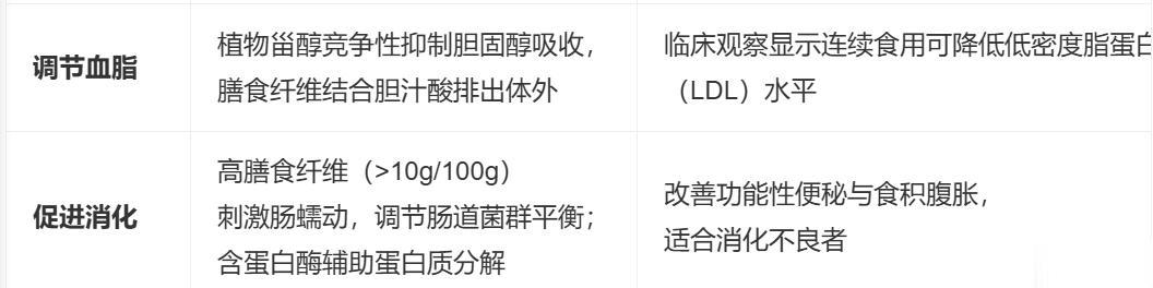 | 调节血脂 | 植物甾醇竞争性抑制胆固醇吸收,膳食纤维结合胆汁酸排出体外 | 临床观察显示连续食用可降低低密度脂蛋白(LDL)水平 |