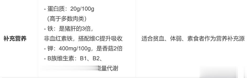 | 补充营养 | - 蛋白质:20g/100g(高于多数肉类)- 铁:是猪肝的3倍,非血红素铁,搭配维C提升吸收- 钾:400mg/100g,是香菇2倍- B族维生素:B1、B2、烟酸含量丰富,参与能量代谢 | 适合贫血、体弱、素食者作为营养补充源 |