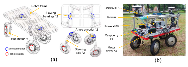 江苏大学和拉夫堡大学团队提出了一种四轮独立驱动+同轴转向(4WID-OAS)的新型机器人平台。前后轴各由一对机械耦合的轮毂电机协同控制,转向完全依靠差速实现,无需额外转向电机。图1 展示了该机器人的设计图和实物原型。