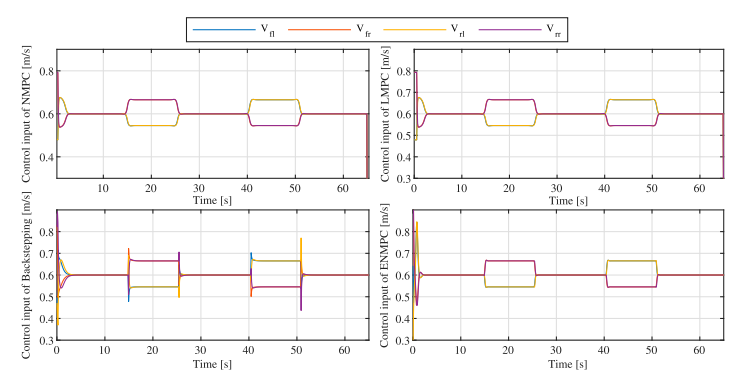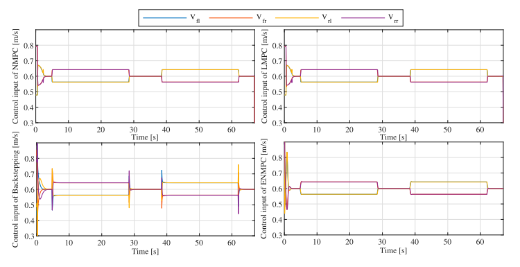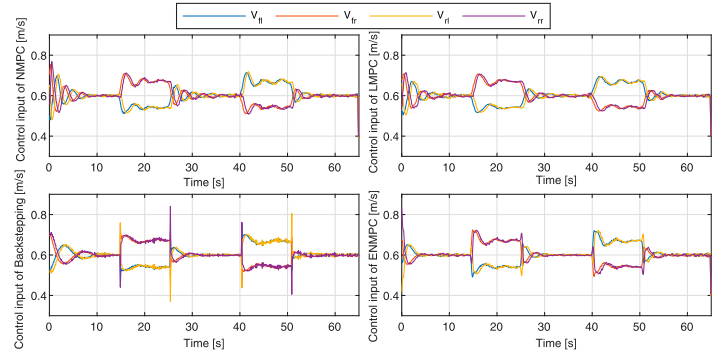 图5 展示了S形轨迹的跟踪结果。反步法在弯道处偏差明显;NMPC精度最高;ENMPC与LMPC性能接近。图6 为四轮速度指令,反步法输出振荡剧烈,而三种预测控制均输出平滑。