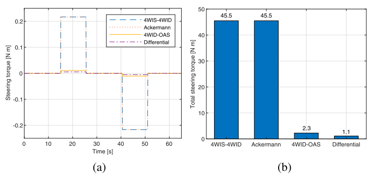 图7 对比了不同转向系统的转向扭矩。4WID-OAS和差速转向的扭矩远小于阿克曼和4WIS,这是因为后者需要克服侧向轮胎力,而前者通过轮速差产生横摆力矩,轮胎接近纯滚动。