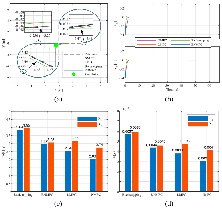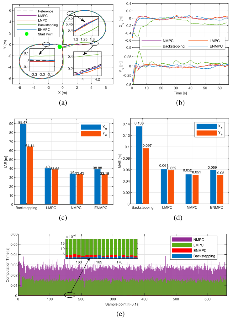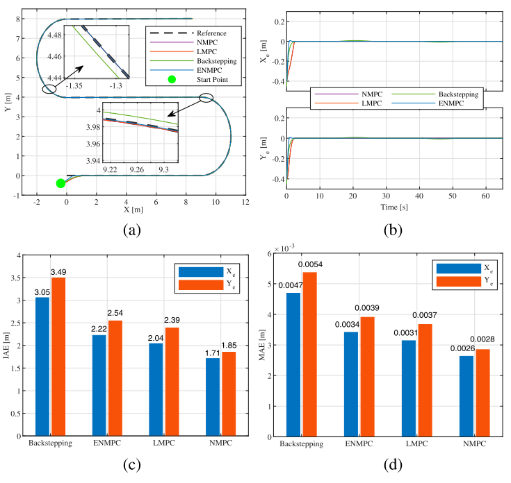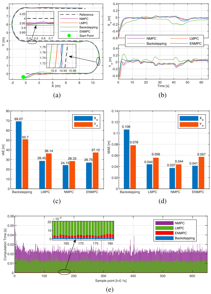 仿真和现场实验对比了ENMPC与常规NMPC、LMPC和反步法。结果表明:ENMPC的跟踪精度与NMPC相当(IAE和MAE几乎相同),但求解时间仅为NMPC的1/10左右,非常适合算力有限的实车部署。