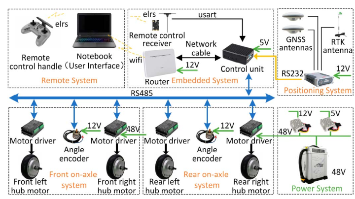 图2 展示了电子系统架构:上位机通过无线网络与树莓派通信,树莓派执行控制算法并通过RS-485驱动四个轮毂电机。