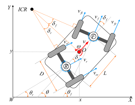 该机器人的独特之处在于:前后轴各通过回转支承与车架连接,每个轴的转向角由两侧轮毂电机的差速控制。图3 展示了机器人的运动学模型,定义了瞬时转动中心(ICR)以及前后轴转向角