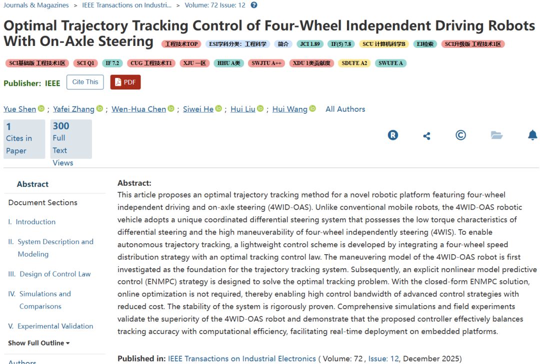 引文格式:Shen Y, Zhang Y, Chen W H, et al. Optimal trajectory tracking control of four-wheel independent driving robots with on-axle steering[J]. IEEE Transactions on Industrial Electronics, 2025, 72(12): 13842-13852.