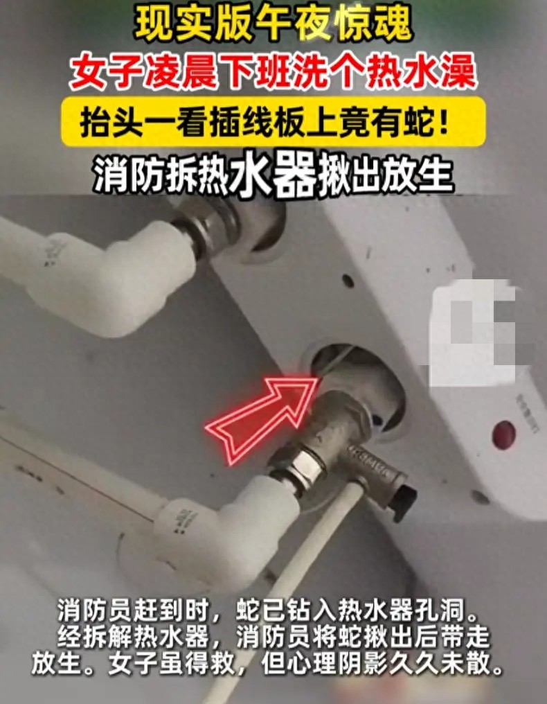 事情是这样的:一位女生凌晨才下班,拖着一身疲惫回到家,想着赶紧冲个热水澡解解乏。结果刚进浴室,抬头的瞬间,直接吓得魂飞魄散——热水器旁边的孔洞里,居然钻出来一条蛇!