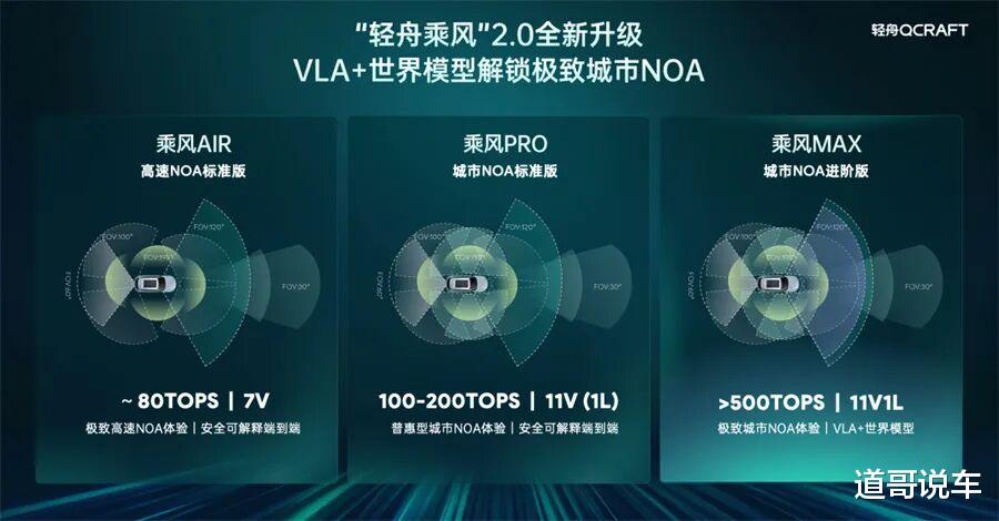 作为突围的核心支撑,“轻舟乘风2.0”三级产品矩阵已全面落地:其中乘风AIR凭借约80TOPS算力与7V配置,能够提供极致的高速NOA体验;而乘风PRO则采用约100至200TOPS算力以及11V或11V1L的传感器配置,在提供普惠型城市NOA体验的同时,轻舟还打造出了行业首个仅需128TOPS算力即可实现的城市NOA体验;至于定位最高的乘风MAX,它拥有超过500TOPS的算力并采用11V1L配置,深度融合VLA与世界模型,旨在打造极致的城市NOA体验,该方案将于今年正式发布,从而进一步巩固轻舟在大算力城市智驾领域的领先地位。
