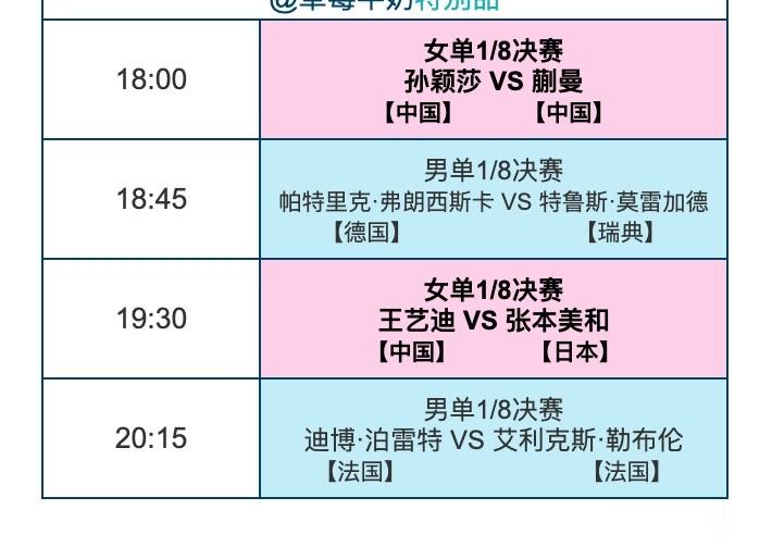今日赛程白天段有四场比赛,晚间有四场比赛,白天段的比赛结束后,王曼昱、温特晋级女单8强,张本智和、松岛辉空晋级男单8强,晋级8强的选手可获450积分。