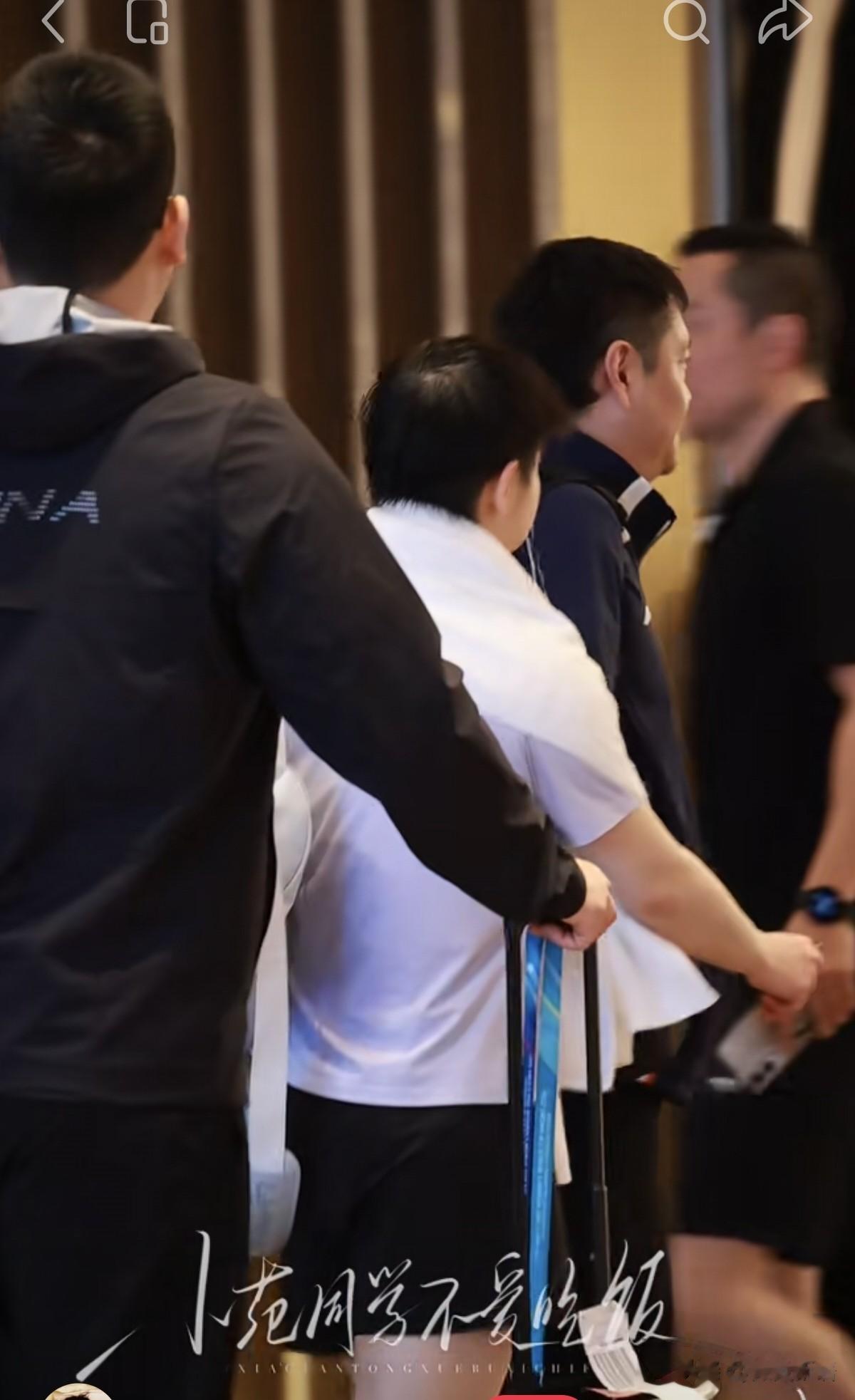上午覃予萱和温特的比赛,场外是邱贻可教练,覃予萱的比赛结束后,邱导也去了训练场馆,等莎莎训练结束后,他们一起回的酒店,看到莎莎又披着毛巾回去了,回去的时候也是穿着拖鞋,翔哥也在后面跟着,任姐应该也在,从成都封训到澳门世界杯,任姐跟莎莎也是形影不离,她得看着莎莎,控制莎莎的饮食。
