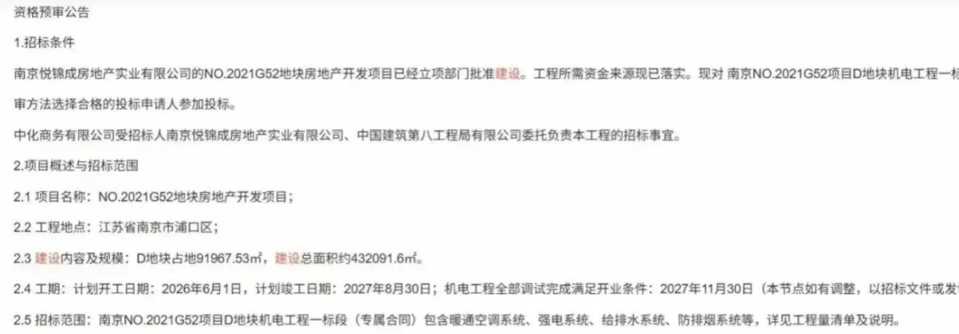 2026年3月,南京大悦城D地块机电工程招标正式发布,项目敲定2026年6月1日全面复工,2027年8月30日竣工。