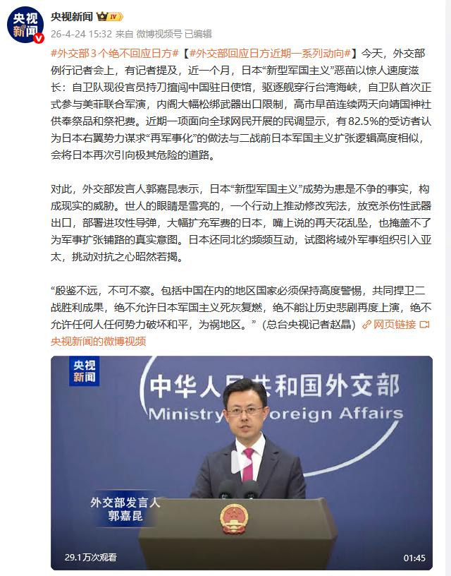 中国外交部4月24日直接定性:日本“新型军国主义”成势为患,构成现实威胁。