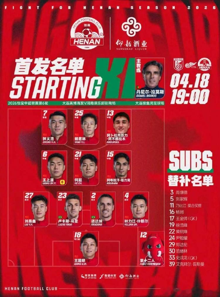 河南队主帅今天派出433阵型!双外援出战,外援古斯塔沃、姆布拉和纳萨里奥有伤,未进大名单。