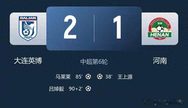 北京时间4月18日晚上,中超联赛第6轮比赛,大连英博坐镇主场迎战河南队,上半场比赛王上源先客为主,打进一球,下半场比赛凭借马莱莱和吕焯毅的世界波破门,最终大连英博主场2-1逆转河南队,取得四连胜!