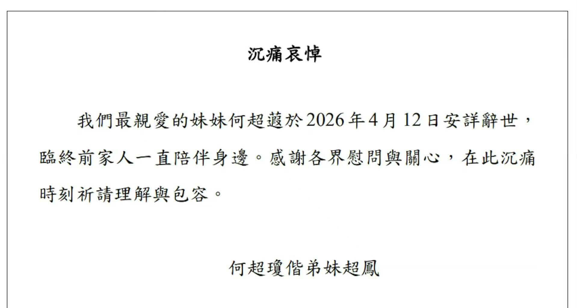 何超琼带领妹妹弟弟们悲痛发讣告,讣告中称何超蕸离世时间是2026年的4月12日,临终前家人都一直陪伴在她身边。至于何超蕸为何突然离世,讣告中并没有说,连何超蕸享年多少岁也没有说,网络上显示,何超蕸终年是60岁,还非常年轻。