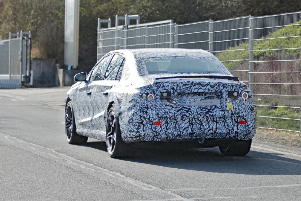 AMG版奔驰E级纯电测试车 :伪装测试车尾部视角,可见临时尾灯与扰流板