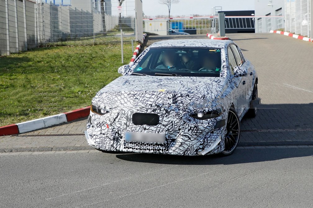AMG版奔驰E级纯电测试车 :伪装测试车正面视角,可见运动化前包围