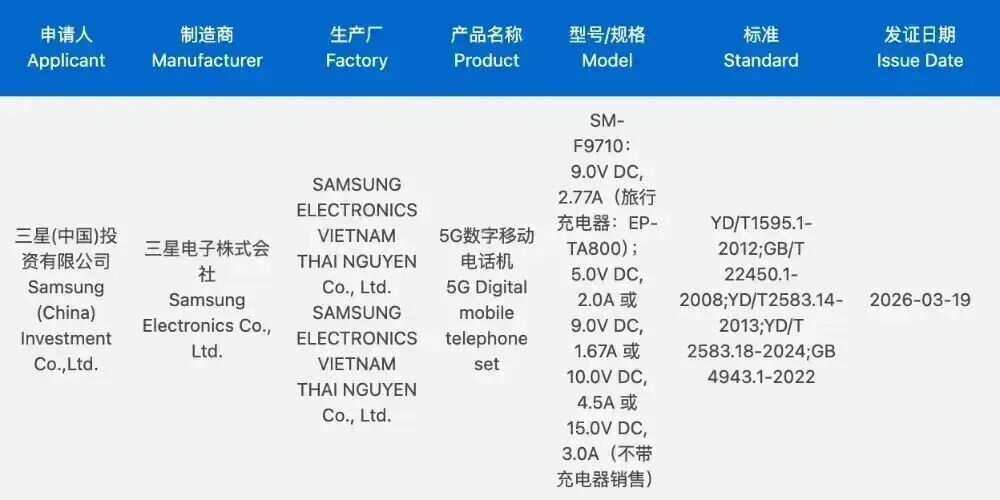 除此之外,型号为 SM-F9710 、 SM-F9760 的两款三星旗下手机在最近通过了认证。