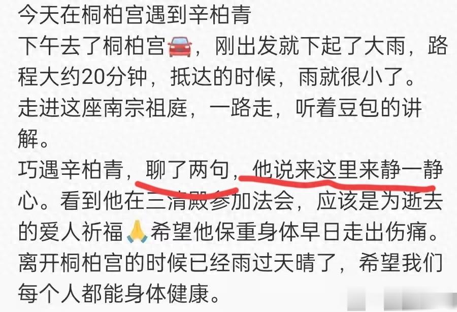 4月16日,有网友在天台山偶遇了著名演员辛柏青,当天下着下雨,还主动上前聊了几句,辛柏青主动透露来这里静一静,然后该网友,就看着他去了三清殿参加活动,为逝去的爱人祈福。