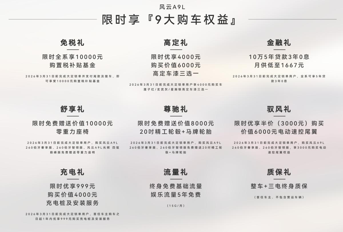 目前,风云A9L全系车型火热销售中,为回馈用户信赖,现推出多重限时购车权益。高定礼:限时优享价值6000元高定车漆三选一;置换礼:限时全系享10000元超级置换金;金融礼:限时免费享价值10000元10万3年0息或5年10万3年0息;舒享礼:限时免费赠送价值10000元零重力座椅;尊驰礼:限时免费赠送价值8000元20吋精工轮毂+马牌轮胎;流量礼:终身免费基础流量,娱乐流量3年免费(10G/月);质保礼:整车+三电终身质保(首任非营运车主)。