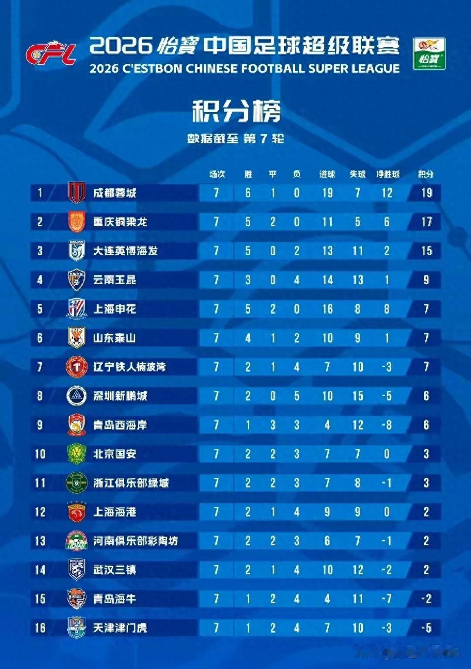 积分榜前三球队:1. 成都蓉城:7战6胜1平积19分,稳居积分榜第一位。
