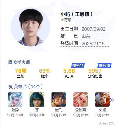 首先是对抗路选手无言,这名选手在赛场上的表现极具存在感,夏洛特18局13胜,狂铁12局8胜,关羽更是10战9胜,无论对线还是团战,都展现出远超新人的沉稳与实力。