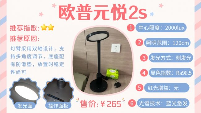 欧普元悦2S护眼台灯主打简约小巧,灯臂做了双轴设计,调节角度还算灵活,底座还带了防滑垫,放在桌上稳稳当当的,不会轻易晃动。操作上比较省心,触控面板滑一滑就能调亮度,还有延时关灯和智能感光功能,能跟着环境光自动调亮暗,满足单人基础读写的操作需求没问题。但虽然采用了侧发光设计,还加了导光板和扩散板,可发光面太小导致中心照度偏高,实际用起来容易刺眼。