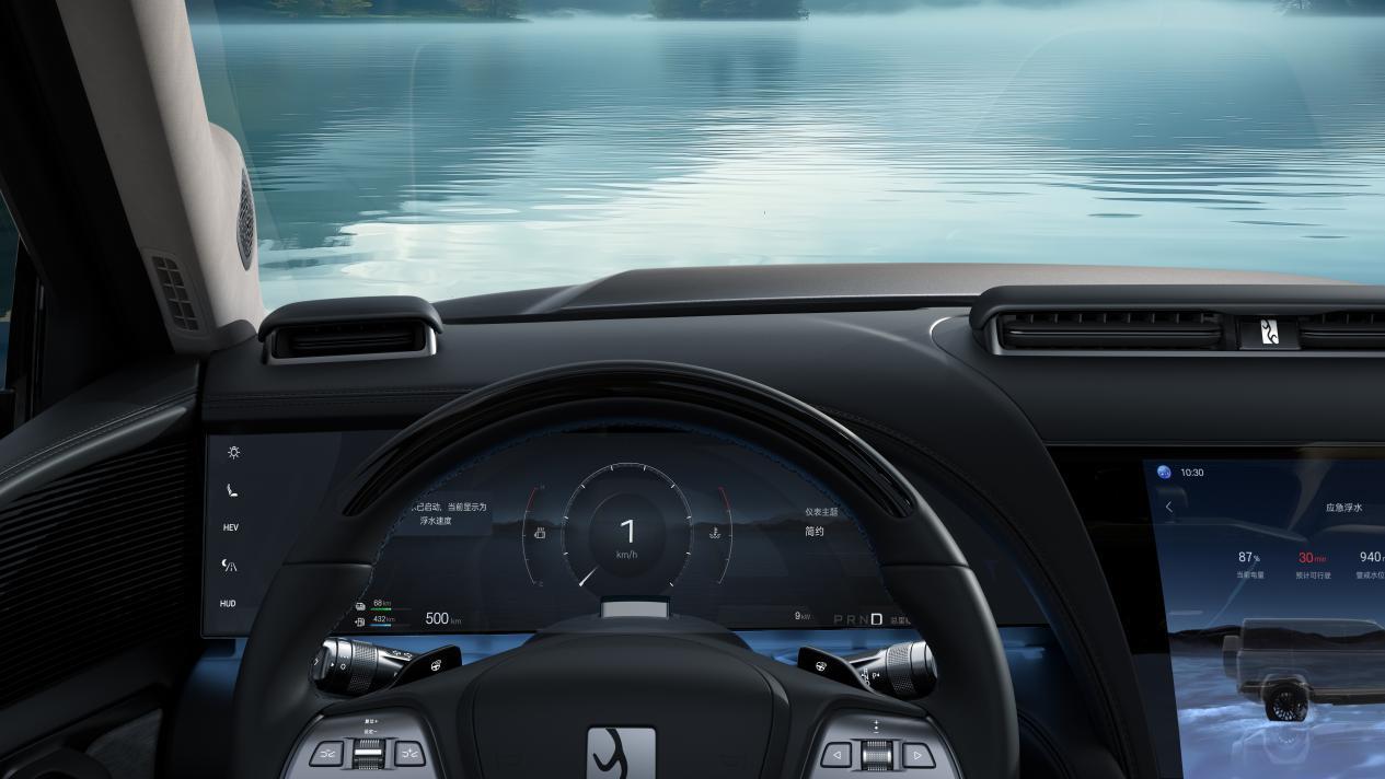 应急浮水功能不仅是仰望U8款的杀手锏之一,也是全球量产硬派越野中独一份的存在。在26款U8上,新增了应急浮水自动激活,即便遭遇意外坠水等紧急情况,当监测到车辆进入漂浮状态后,系统在5秒内自动激活应急浮水模式,此时发动机自动关闭、悬架升至最高、车窗自动升起、空调切换至内循环,全方位保障车内密封性。在浮水状态下,车辆凭借四轮独立控制可实现低速行驶、转向及掉头,最快行驶速度可达3km/h,帮助用户快速脱离深水困境,真正做到“遇水不慌”。