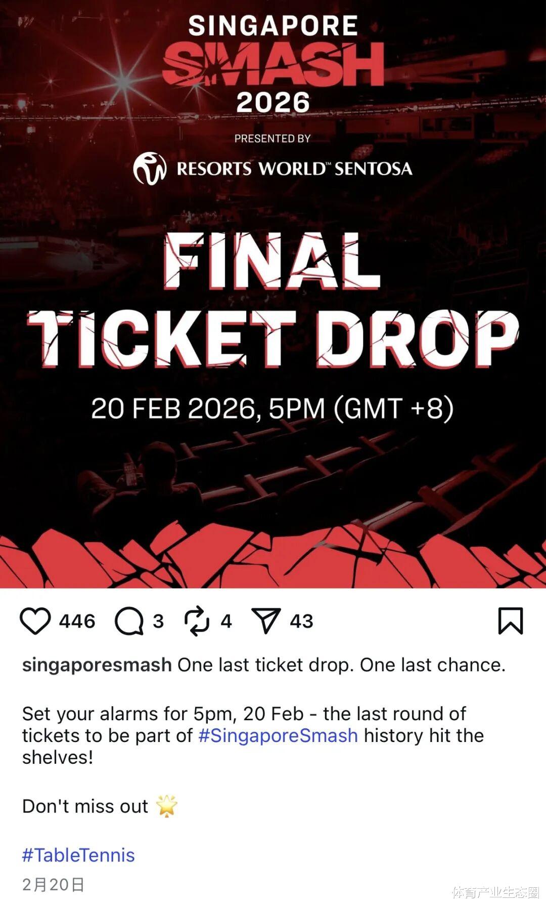 面对庞大的乒乓球受众与持续高涨的观赛热情,国内赛事门票长期供不应求,一票难求、二级市场溢价已成常态。但是在新加坡观赛更为从容:不仅可以更「轻松」地抢到门票,甚至「临时起意」,在比赛日现场仍有官方票公开出售。