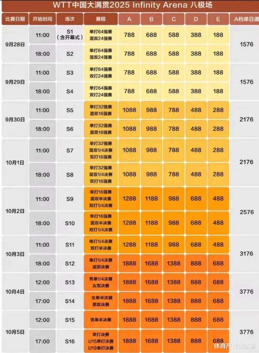 前四个比赛日的最高票价不超过300元,约为中国大满贯的一半左右,且不设固定座位、先到先得,这也意味着,只要愿意提前入场排队,就能占到不错的前排坐席。