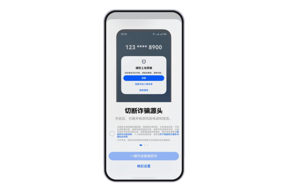 HarmonyOS隐私安全体验再升级,此次HarmonyOS 6.0.0.328 版本更新带来了更进一步的隐私安全保护体验。新增智能防诈功能,用户通过“设置 > 隐私和安全 > 骚扰和诈骗拦截 > 智能防诈”开启后,系统即可为您智能拦截通信、网页、应用等多场景诈骗风险,还能精准识别涉诈环境,对符合诈骗剧本的行为进行阻断并及时提醒,带来更省心的安全守护。