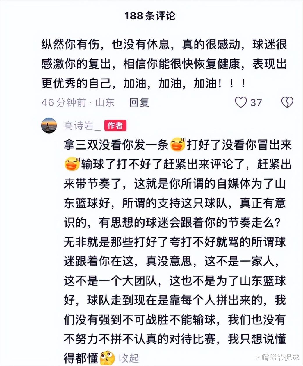 高诗岩打出一大段长文,“拿三双没看你发一条,打好了你没冒出来,输球了打不好了就赶紧出来评论了,赶紧出来带节奏了,这就是你所谓的自媒体,为山东篮球好?”