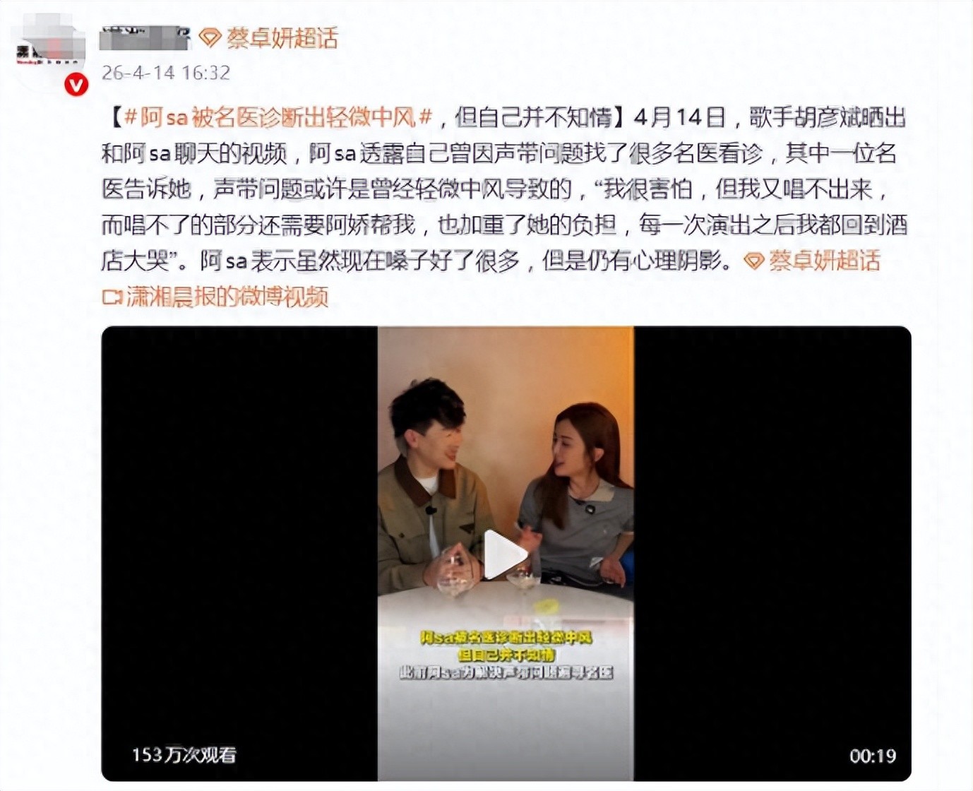 随后,“阿Sa被医生诊断中风”的词条,就冲上了热搜,胡先生晒出了他们聊天的视频,