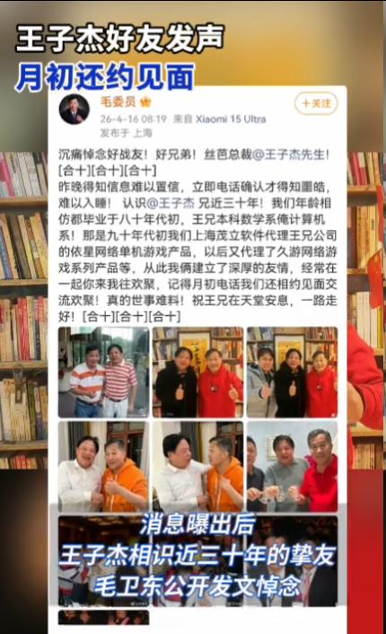知情人称王子杰系开会时突感心脏不适倒地,好友证实其近年长期高强度工作、频繁熬夜---2026-04-16----九派新闻