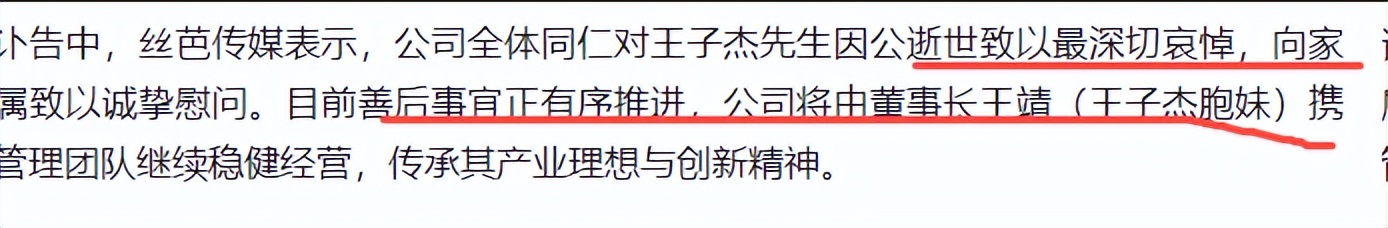 根据讣告,丝芭传媒将由王子杰的胞妹王靖接任董事长,带领管理团队继续经营,公司能否平稳过渡,艺人纠纷如何解决,这些问题的答案,王子杰已经无法看到了。
