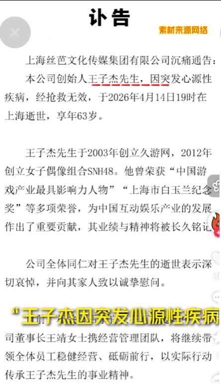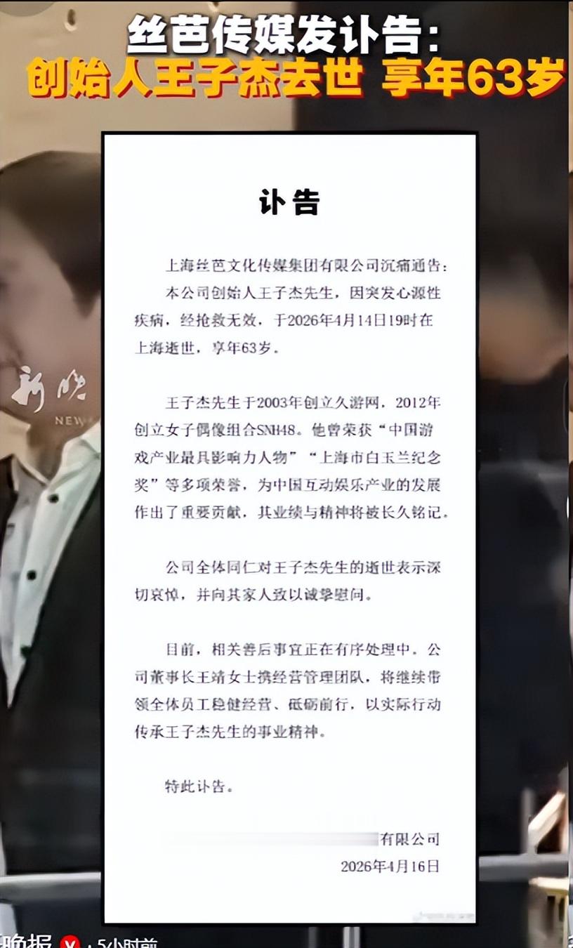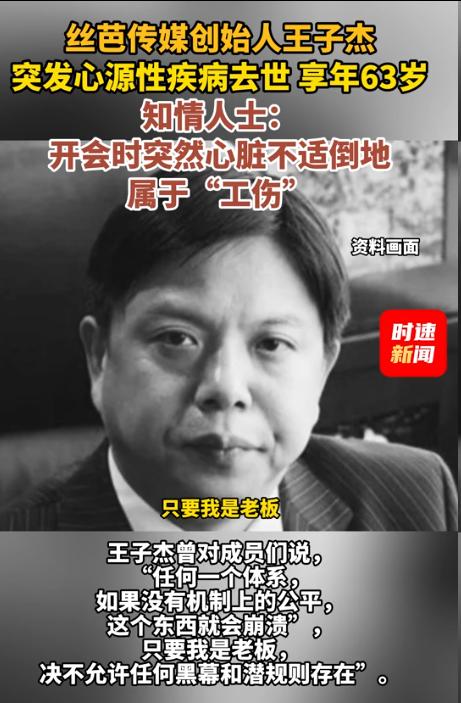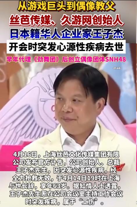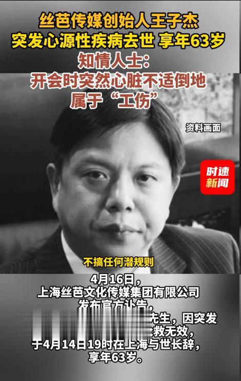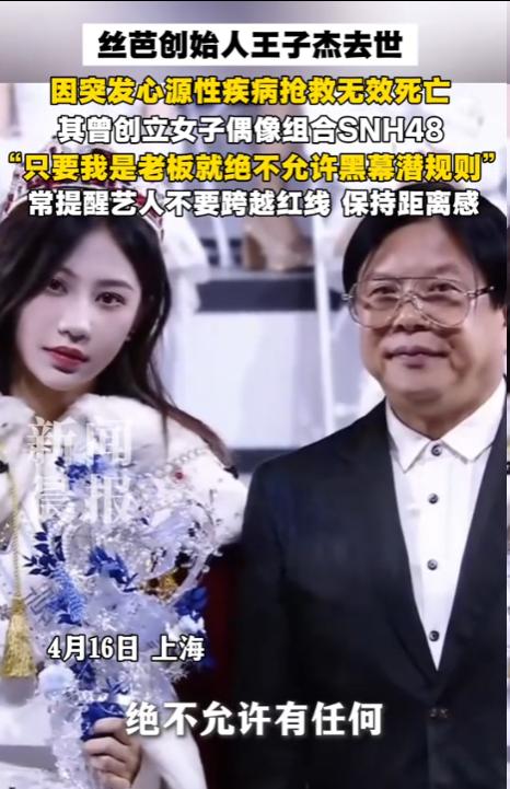 4月14日晚上7点,丝芭传媒创始人王子杰因突发心源性疾病在上海去世,从发病到离世不过短短几个小时。