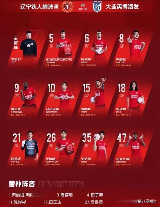 大连英博首发阵容:门将:黄子豪,