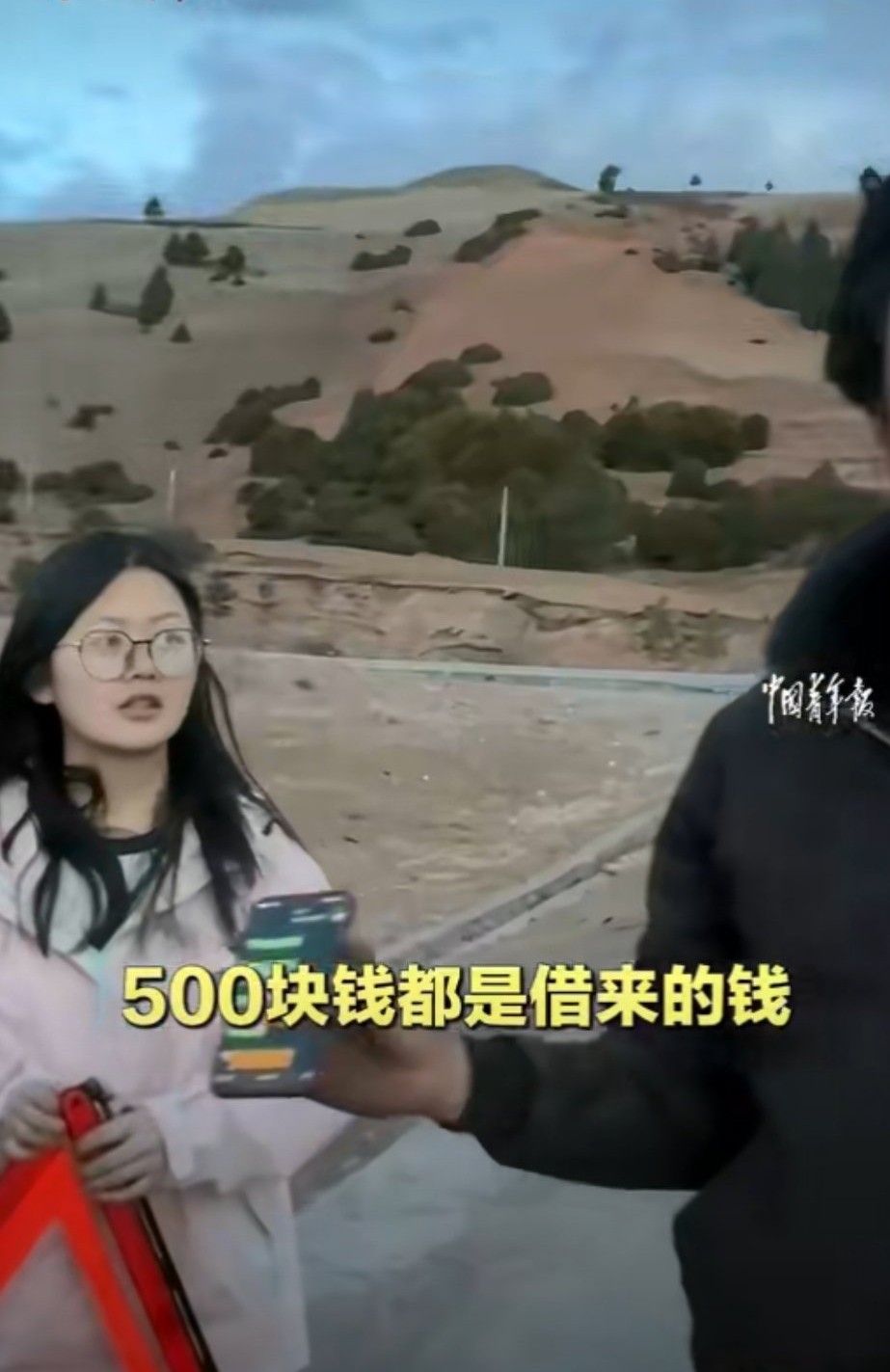姑娘车轮胎废了,修一下大概要八百块。交警过来一调解,才发现这事儿有点难办——藏族大哥家里条件确实不好,兜里揣的那五百块钱,是刚跟人借来有急用的,全掏出来也够不上修车钱。