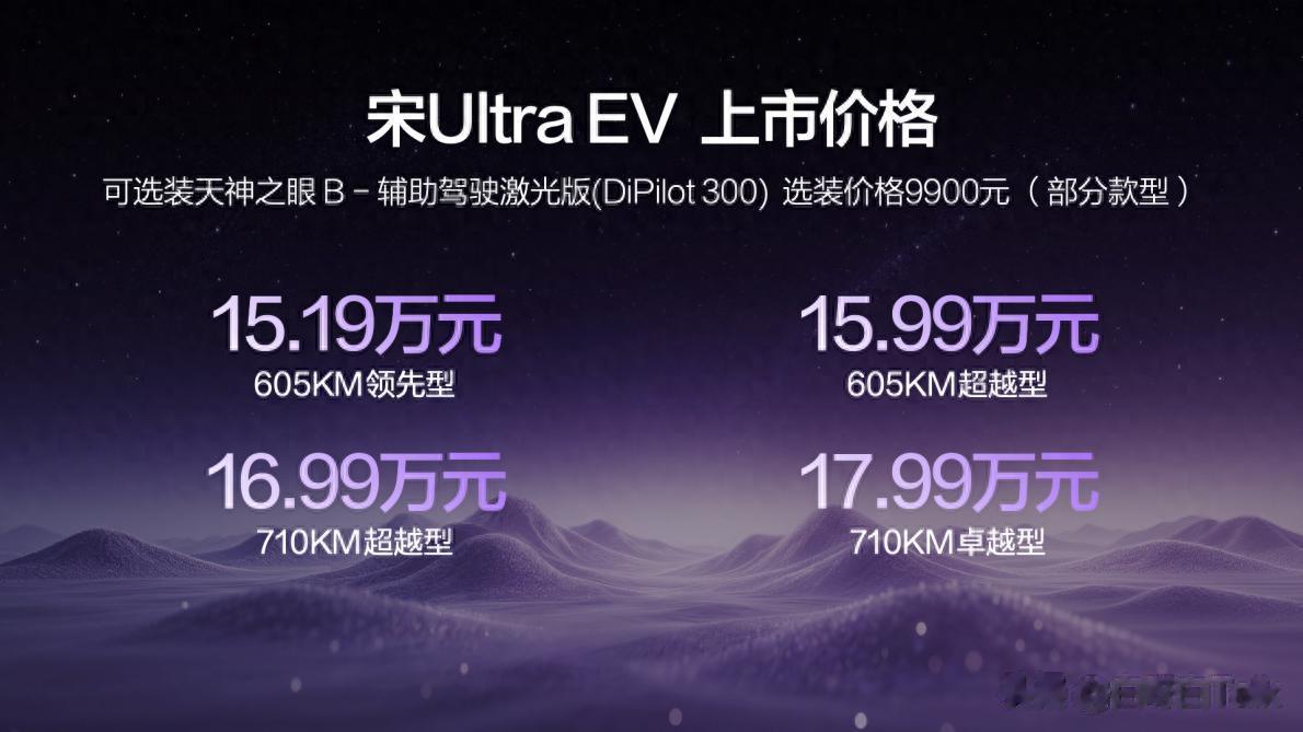3月26日,比亚迪旗下全新纯电力作——宋Ultra EV正式登陆市场,共推出605KM领先型、605KM超越型、710KM超越型及710KM卓越型四款配置,官方售价区间定为15.19万元至17.99万元。新车全系标配比亚迪第二代刀片电池与闪充技术,并集成710公里CLTC纯电续航、天神之眼B智能驾驶、云辇-C智能车身控制、TBC高速爆胎稳行系统等高端配置,以技术革新重塑B级纯电SUV价值标准,正式开启"闪充出行"新篇章。